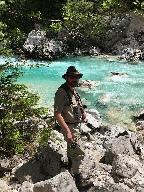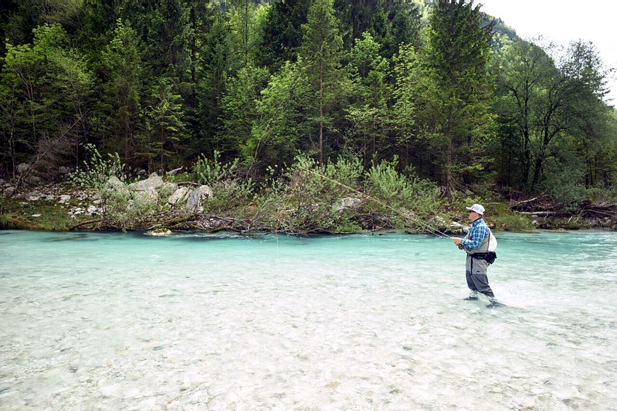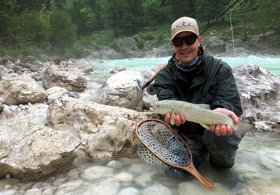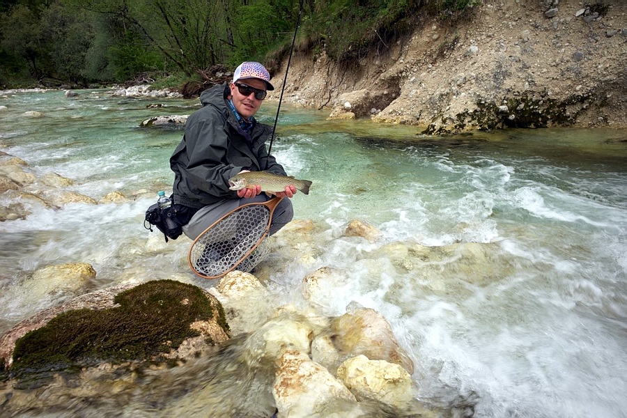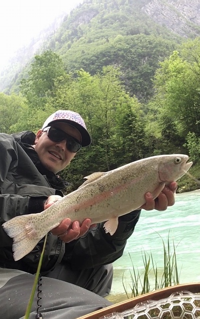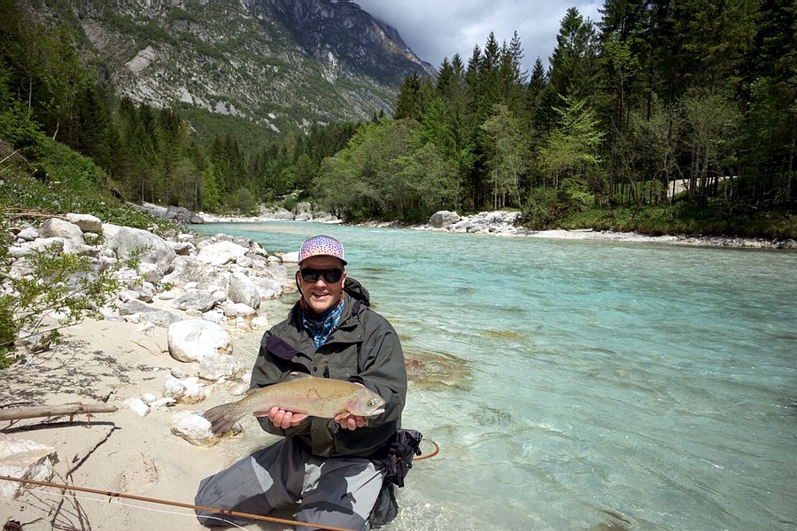 an der Soca eine richtig dicke Regenbogenforelle an seiner Gespließten.
