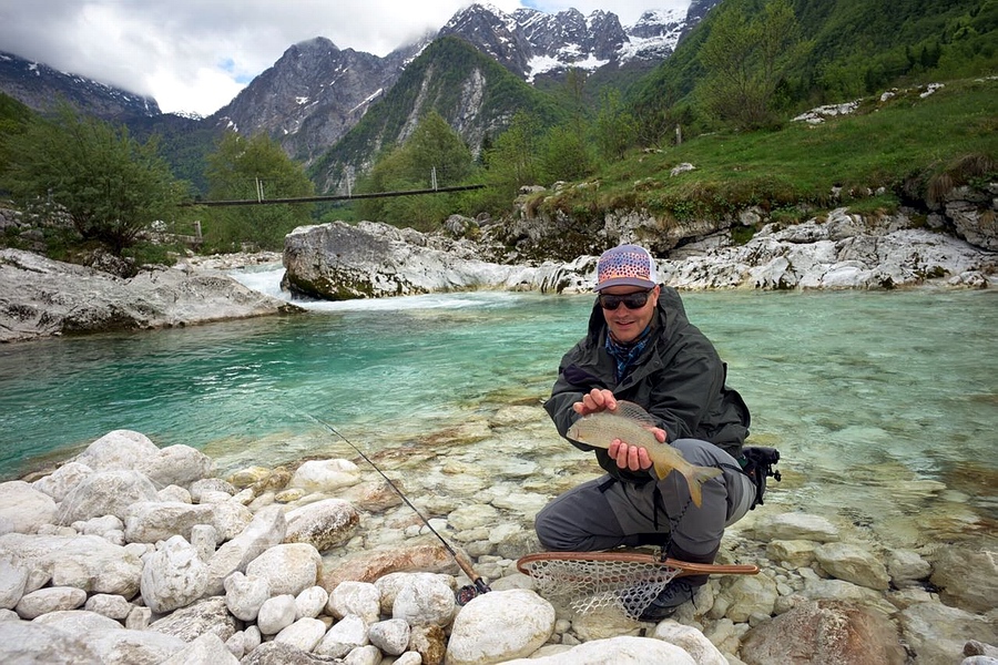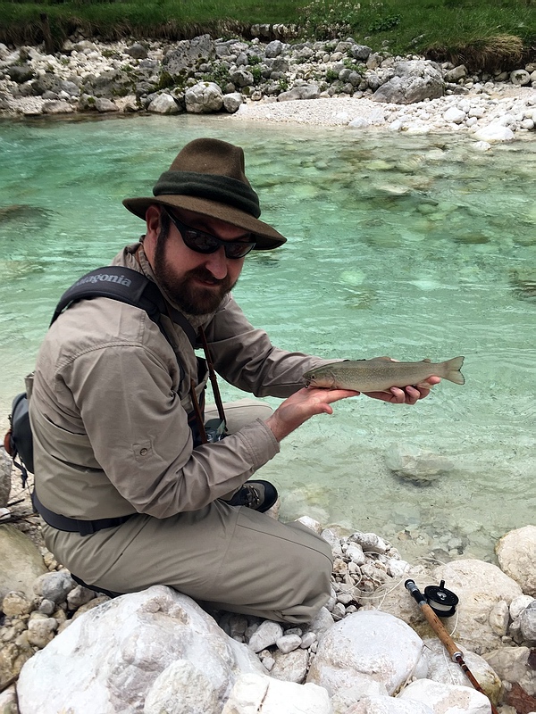 Davor machten wir aber dann dennoch einen kurzen Abstecher an die Lepena (wir waren einfach zu neugierig). Die Lepena ist ein kleiner, sehr schöner Fluss, welcher einen durchaus hohen Angeldruck erfährt (so jedenfalls unser Eindruck, da wir an diesem Fluss immer mehrere Fliegenfischer antrafen). Dort in dem straßenseitigen Pool waren schöne Forellen zu erkennen. Sie zu fangen war jedoch so gut wie nicht möglich. Simon konnte jedoch eine „rauspflücken“, während ich etwas stromab eine schöne Äsche fangen konnte. Ebenfalls konnte Simon in einem kleinen Kehrwasser eines Felsens eine kleine Marmorata fangen. Wer übrigens denkt, dass in der Lepena keine großen Forellen zu finden sind, der irrt sich gewaltig. Wir haben Fische dort gesehen die jenseits der 70cm Marke waren und hierbei handelte es sich nicht nur um Marmoratas! Damit beendeten wir auch unseren ersten Tag und waren bereits jetzt schon mehr als „seelig“ und zufrieden. Das Wetter war schön, das Wasser klar und wir hatten schöne Fische gefangen und richtig große Fische gesehen. Was will man denn mehr! |