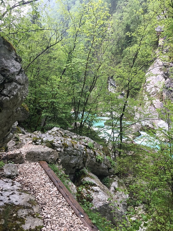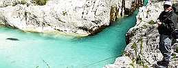Dort angekommen sticht einem von oben herabblickend das schier traumhaft blaugrüne Wasser ins Auge. Der Fluss mit seinen Felsen und den charakterlichen dunklen, im Wasser liegenden Steinen ist wirklich atemberaubend und für mich der schönste Fluss überhaupt. Das Ganze eingepackt bzw. umgeben von den hohen Bergen der Julischen Alpen (hier gehen unweit vom Ufer die 2000èr in die Höhe). Das ist schon sehr imposant! |