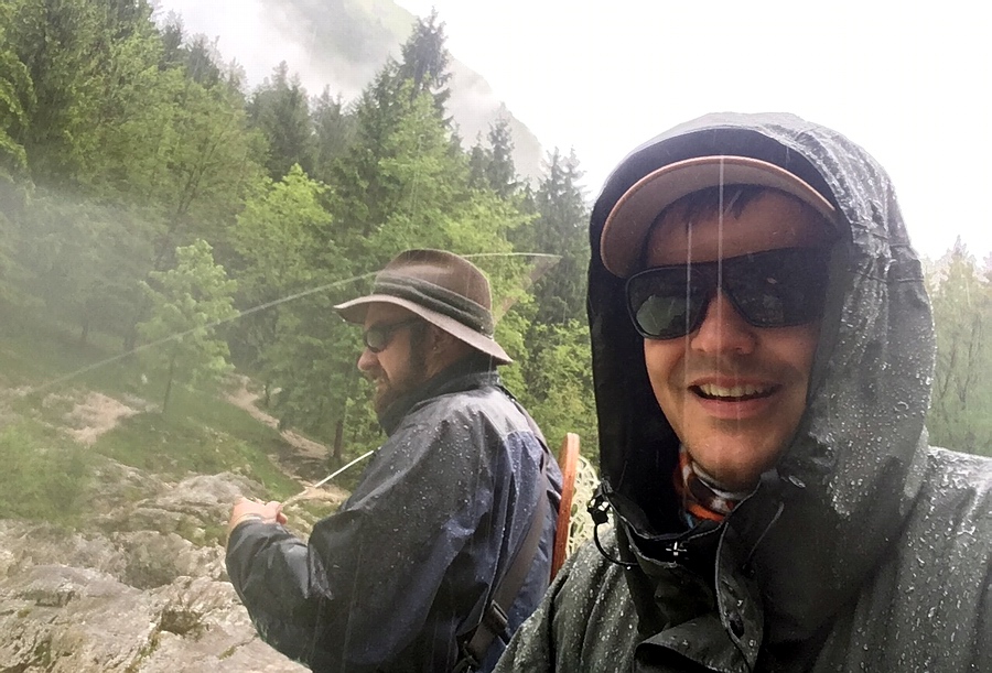 | Tag 2 begann nach einem guten Frühstück an der Lepena. Ein mächtiger Pool mit stapelweisem Totholz roch regelrecht nach dicken Forellen und Co. Also versuchten wir dort unser Glück. Was soll ich sagen, die ersten Würfe bzw. die extreme Strömung beförderten unsere Fliegen direkt ins Totholz, welches scheinbar bis tief in den Pool reichte. Kurz gesagt, es war dort erstmal eine Materialschlacht für uns beide! Dennoch konnten Simon und ich zwei schöne Fische rauskitzeln. Inzwischen zog sich das Wetter schon zu. Auf halber Höhe der Berge erschienen bereits dicke Nebelschwaden. An der Lepena konnten wir noch schöne Forellen fangen und dicke Marmoratas im „Felsen-Pool“ beobachten. Leider konnten wir diese an diesem Tag nicht befischen, da andere Angler bereits ihr Glück dort versuchten und wir wollten hier nicht stören. So packten wir ein und fuhren an die Soca weiter. |