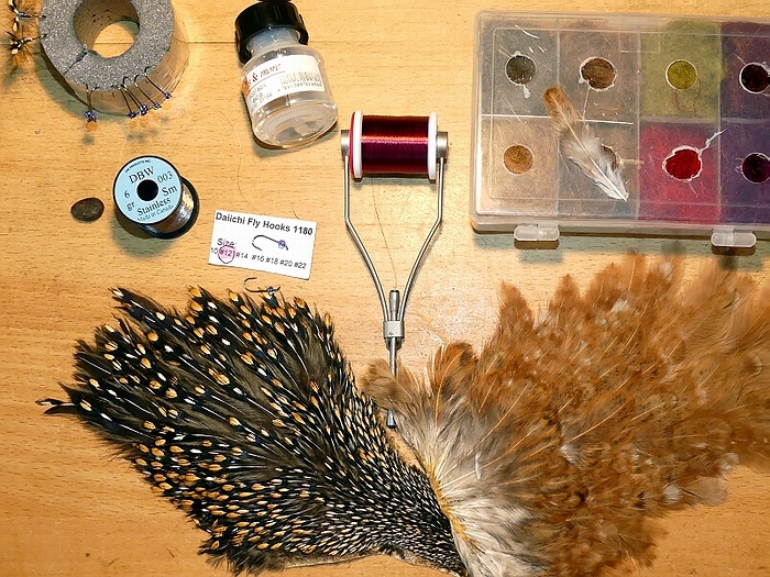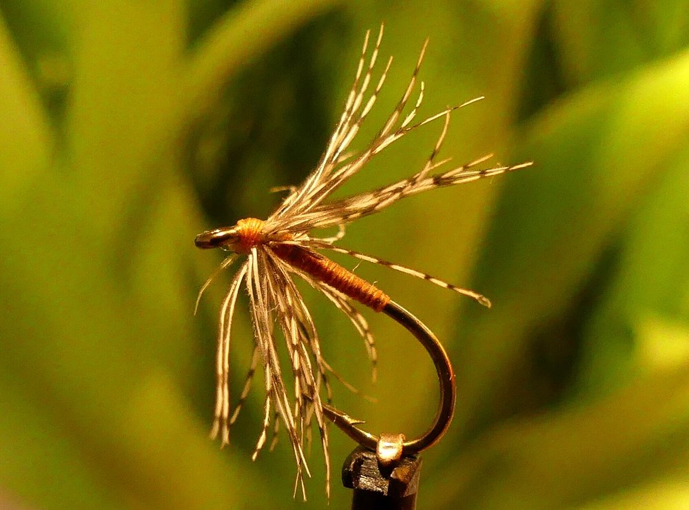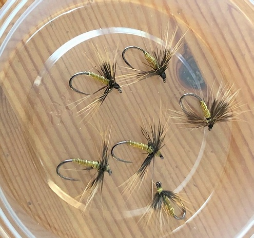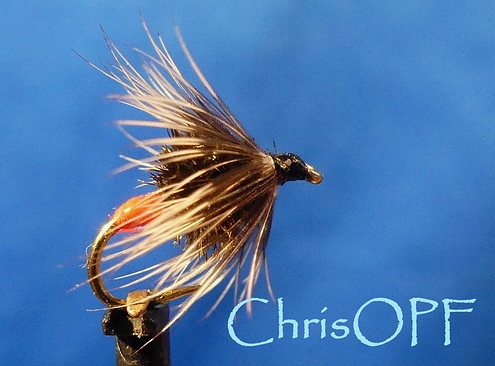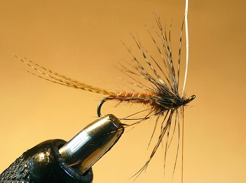 Haken: TMC 100BL #14 Thread: Gossamer Silk, Highland Green Abdomen: Gossamer Silk Thorax: Peacock herl Hackle: Whiting hen cape Bindeanleitung: |
