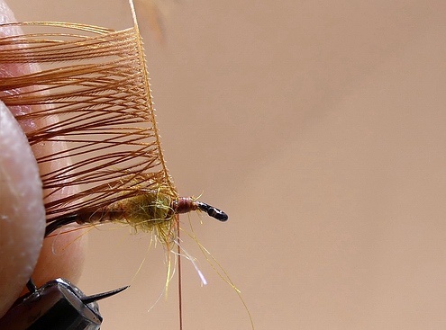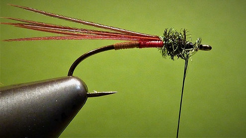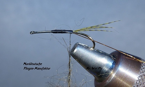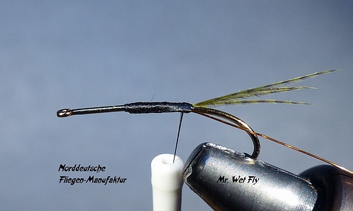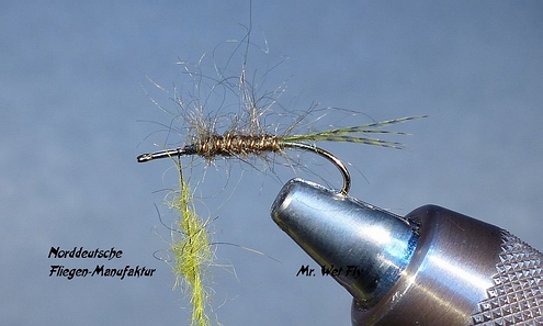 Haken: Tunca Terrestial #12 Schwänzchen: Mallard Flank oliv Körper: Antron Dubbing oliv Thorax: Squirrel Dubbing Light oliv Rippung: Kupferdraht Hechel 1: Whiting Hennensattel oliv Hechel 2: Whiting Hennensattel schwarz Bindefaden: Uni Thread 8/0 Bindeanleitung: |