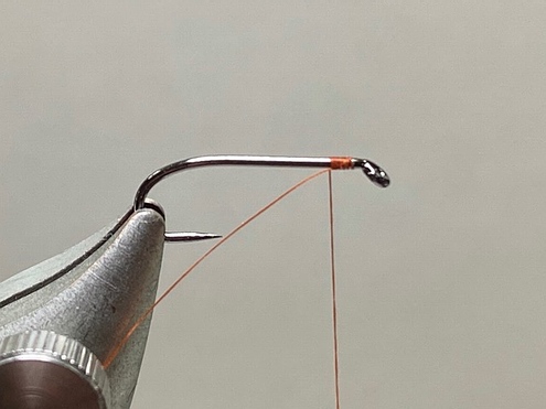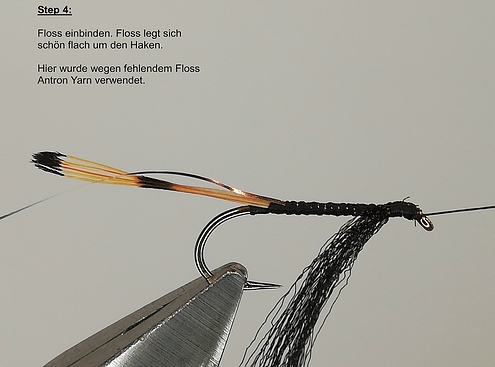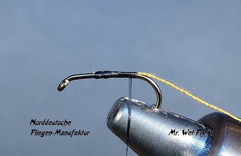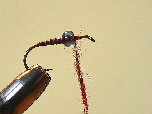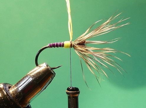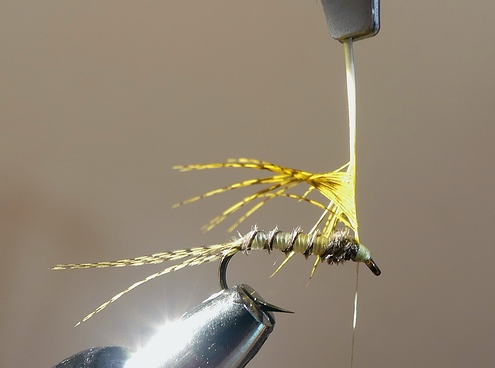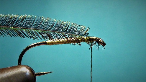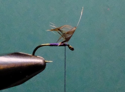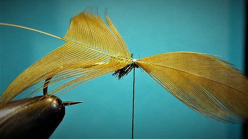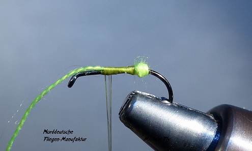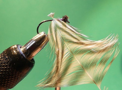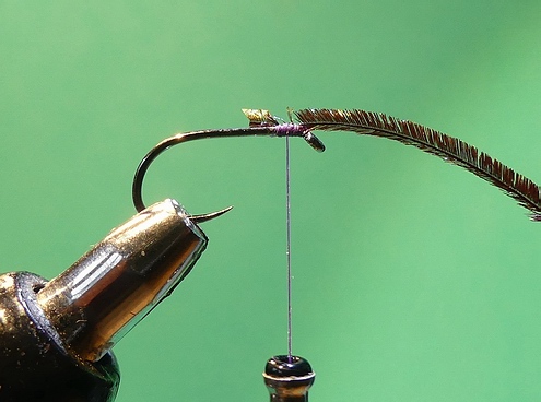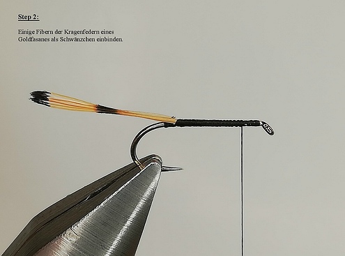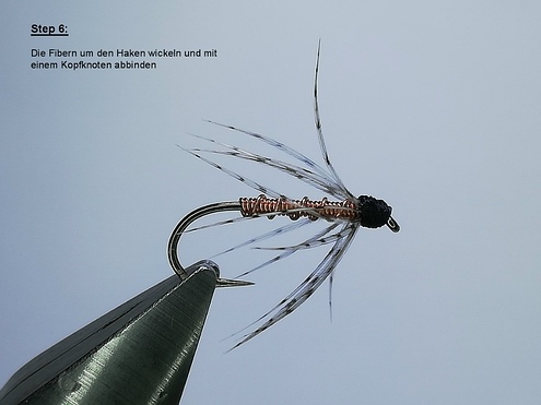 | Anschließend binden wir ein Stück Pfauengras über das Hakenöhr stehend ein, um es vorsichtig mit ein paar Windungen ab der Hechel beginnend als Köpfchen einzuarbeiten. | ![]() |