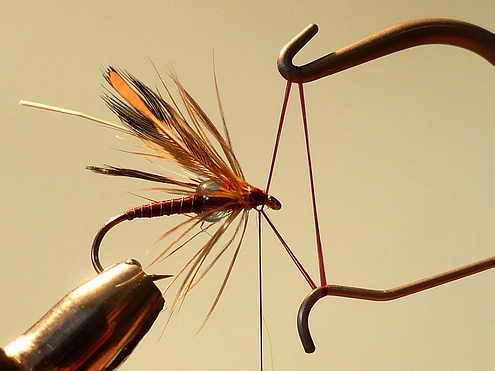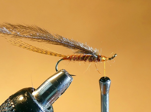 Haken: Daiichi Wet 1740 #12 Bindefaden: Ultra Thread 70 Burnt Orange Tag: Bindefaden Schwänzchen: Mallard Flank Wooduck gold Rippung: Gütermann-Seide Col.488 (1 Faden) Körper: Dubbing-Mix UV Nice Dubb div Brauntöne, wenig Antron schwarz Thorax: Strauß natur Hechel: Selected Brown Back Partridge natural Köpfchen: Bindefaden Sonstiges: MK-Wachs *) Bindeanleitung: |