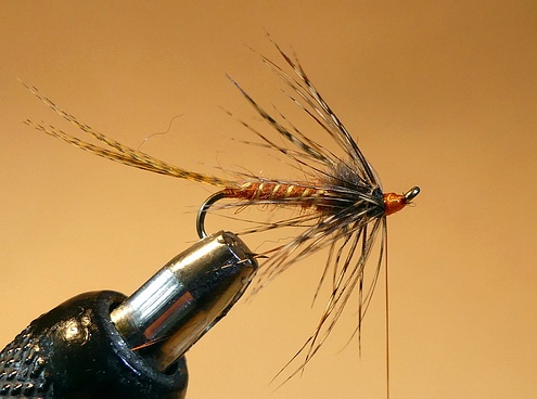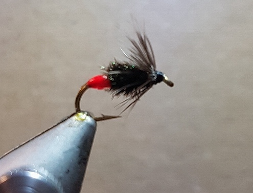 entfernt von Metallperlen. Weiter hinten im Buch werden auch ein paar Muster vorgestellt – mir spunkte aber mein „Jungle Killer“- Muster (so ähnlich als Nymphe, gesehen in der "Peche mouche" No 131) im Kopf herum und die folgende Softhackle-Fliege ist daraus entstanden. Auch hier fehlt noch die Bewährung am Wasser. |