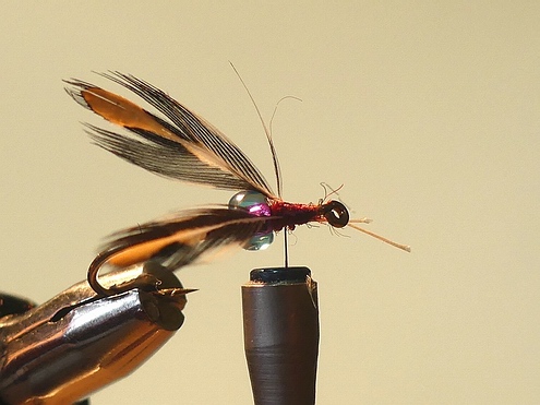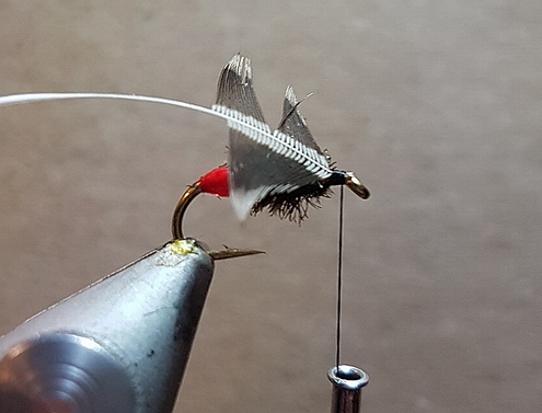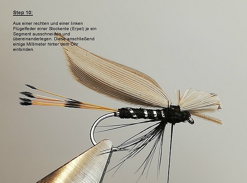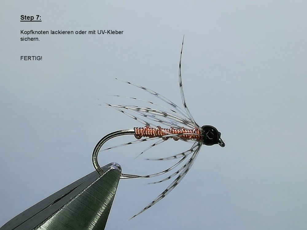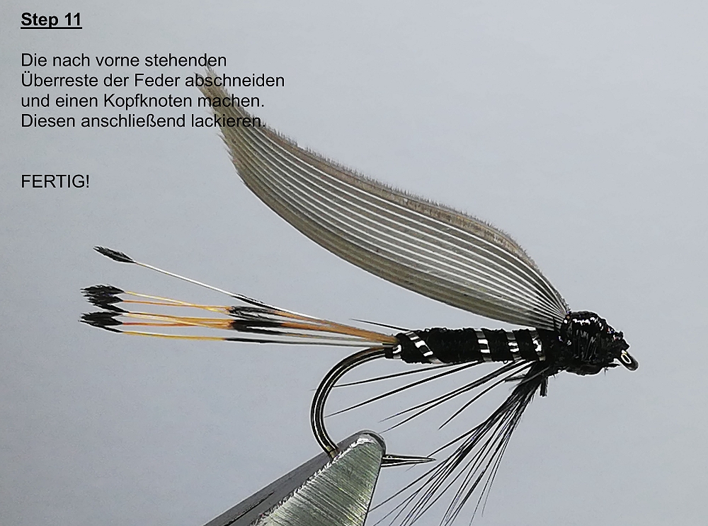 Feder abbinden, mit einen Kopfknoten sichern, etwas Bindelack zur Sicherung auftragen. | Oben: Fertige Fliege. Viel Spass beim Nachbinden. Gruß Bernd |