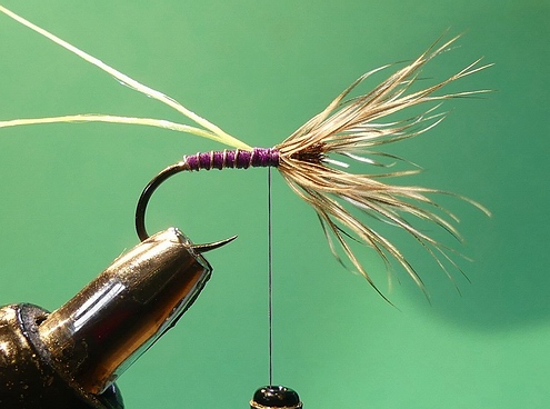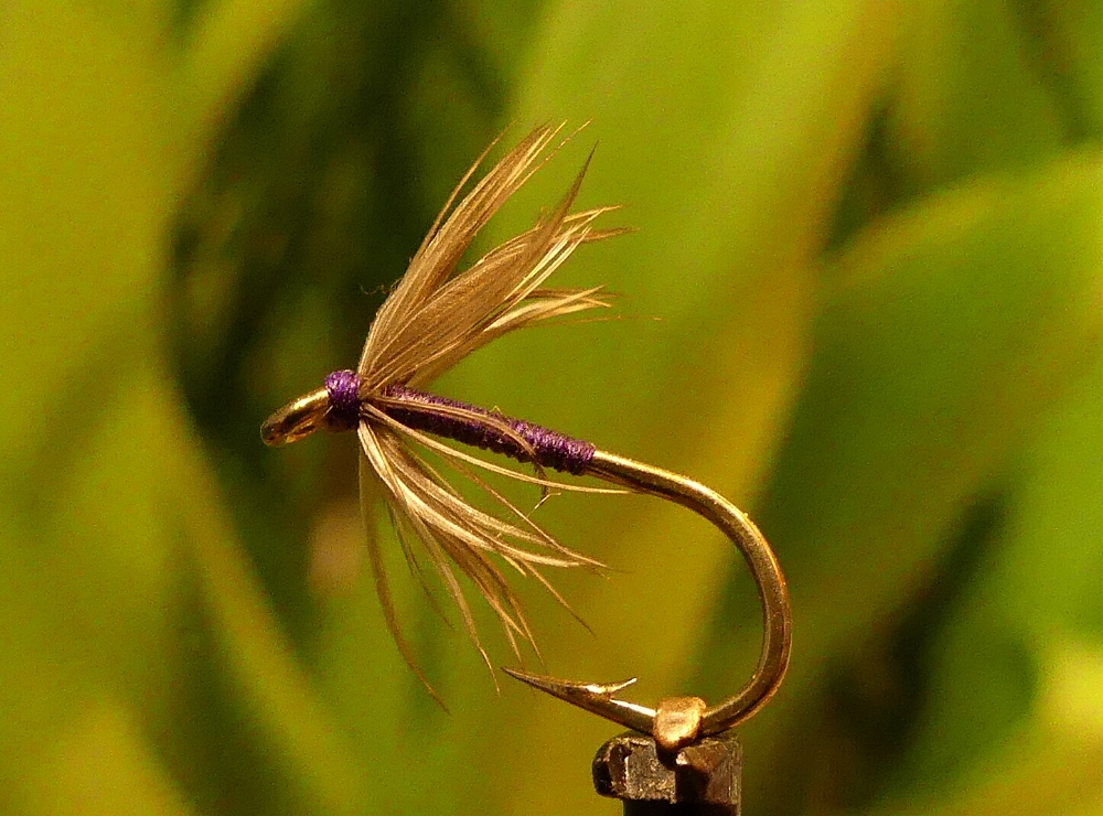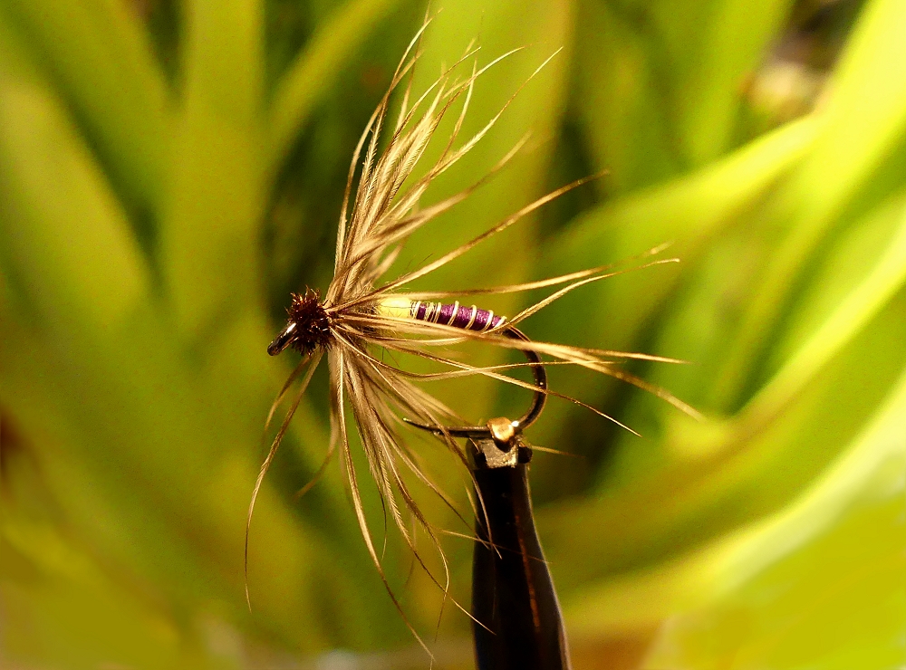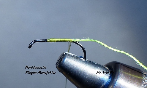 Haken: Demmon Competition W633 BL #14 Bindefaden: Uni Thread 8/0 purple Kopf: Pfaugras (rot gefärbt) Hechel: indischer Hahn Sattel grizzly *) Hinterleib: Bindefaden Rippung: Uni French Silberdraht XS Hotspot: Ultra Thread 280 Fluo Chartreuse Thorax: Maulwurf im Touch-Dubbing Sonstiges: Bienenwachs (Sigi) *) Ich habe z.Zt. leider keine Grizzly-Hechel von