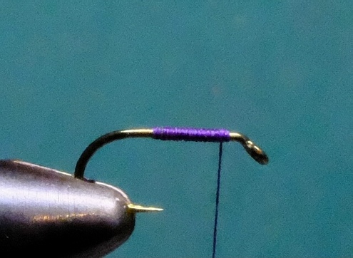 - 14er Haken barbless - Grünes Bindegarn 6/0 - Hasendubbing grau-oliv - Partridge Hackle - Pfauengras Bindeanleitung: Wir beginnen mit einer Grundwicklung bis vor den Schenkel und lassen genug Platz zum Öhr, um später noch die Hechel zu befestigen und das Köpfchen zu binden. Ein kleines bisschen Hasendubbing am gewachsten Faden gibt der Hechel einen Punkt, um sich daran aufzurichten. Überschüssiges Dubbing entfernen wir. |
