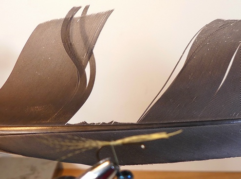 5-6 Fibern einer oliven Mallardfeder einbinden
