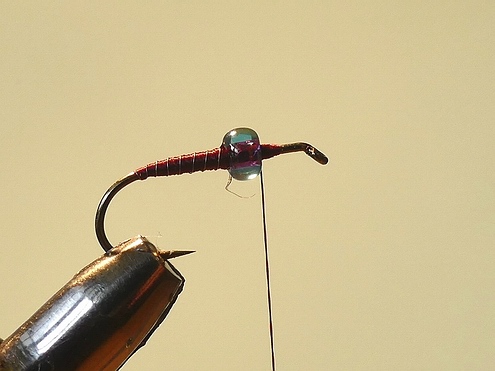 Haken: Daiichi 1180 # 12 Bindefaden: Ultra Thread 70 wine Rippung: Uni DBW Stainless SM 003 Körper: Bindefaden Thorax: Glasperle blau-opak ca. 2,5mm Flügel: 2 Jungle Cock Federn*) Hechel: indischer Hennenbalg hellbraun Sonstiges: MK-Wachs, Bindelack, alte Schere *) Die Verwendung von Jungle Cock oder genauer