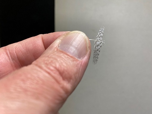 | Die Perle auf den Haken aufziehen und auf Thoraxhöhe