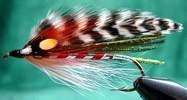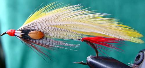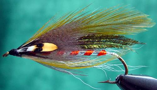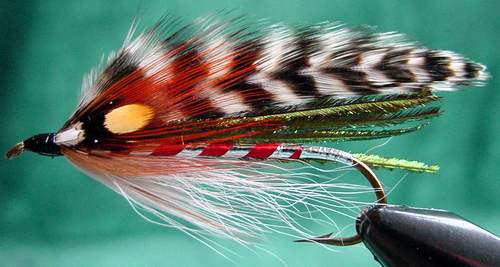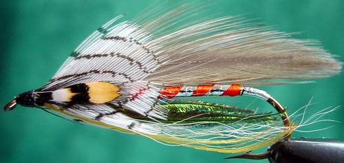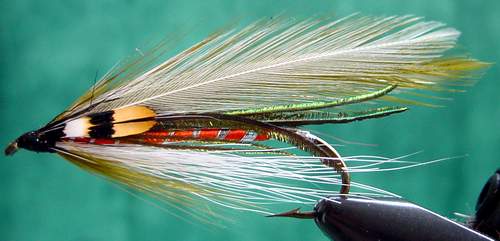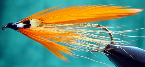 Haken: Mustad 79580, Größe 2-4 Bindegarn: Danville 6/0, schwarz Tag: flaches Silbertinsel Körper: orangefarbenes Floss Rippung: flaches Silbertinsel Unterschwinge: 5 Pfauengrasfibern, darüber ein wenig (nicht zuviel !!) weißes Bucktail als Abschluss eine goldene Schopffeder vom Goldfasan Oberschwinge: 4 mittelgraue Sattel- oder Hahnenhecheln Wangen: Körperfeder vom Silberfasan, darüber Jungle Cock |