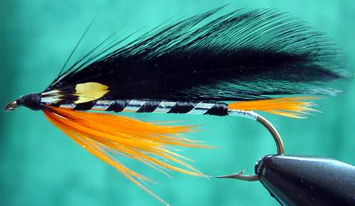 Haken: Mustad 79580, Größe 2-4 Bindegarn: Danville 6/0, schwarz Tag: flaches Silbertinsel Körper: schwarzes Floss Rippung: flaches Silbertinsel Unterschwinge: ein wenig weißes Bucktail, bis zum Hakenbogen reichend, orange Hechelfibern Oberschwinge: 6-7 Fibern Pfauengras, darüber 2 orangefarbene Sattelhecheln sowie 2 dunkelblaue Sattelhecheln, einen „Tick“ kürzer als die Orangenfarbenen. Wangen: braungraue Rebhuhnbrustfedern, darüber Jungle Cock |
