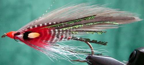 Haken: Mustad 79580, Größe 2-4 Bindegarn: Danville 6/0, schwarz Unterschwinge: weißes Bucktail, bis zum Hakenbogen reichend Oberschwinge: 6 Fibern Pfauengras, darüber 2 große Jungle Cock Wangen: rote Brustfeder vom Goldfasan, darüber Jungle Cock |