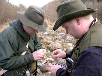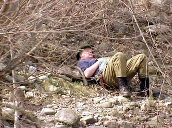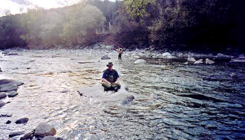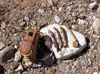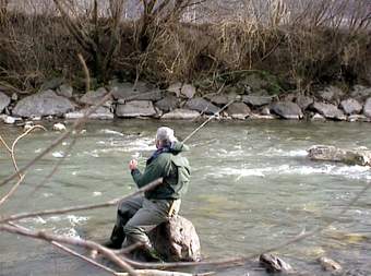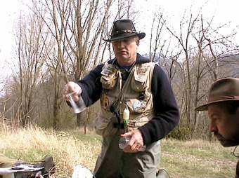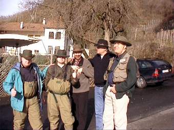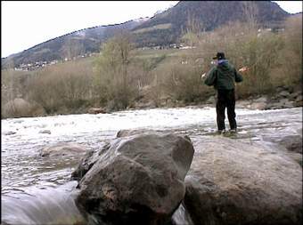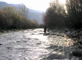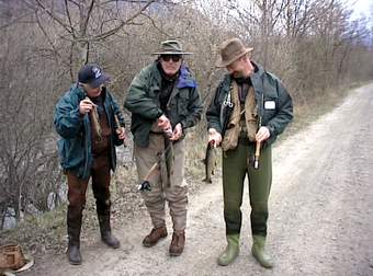 Valeri (oben rechts) kennt das Gewässer gut und sucht die richtige Fliege aus. Ulli rechts) steht an seiner Lieblingsstelle hier fing er innerhalb von 30 Min. 12 gute Fische mit der Nymphe. Jeder sollte nur einen guten Fisch zur Mittagspause an unseren Lagerfeuerplatz mitbringen, um sie zubereiten zu können. Beim Ausweiden des Fisches wurde uns klar, warum seine Stelle so gut war: An seinem Platz hat wohl ein Schwarzfischer mit Forellenfutter angefüttert. Erlaubt sind an der Passer nur Kunstköder. |