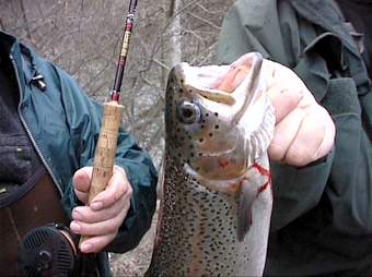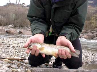 selbst Hybriden hatte ich am Haken. Unten links: Marmorata gefangen mit dem Wooly Bugger Unten rechts: Diese schöne Bachforelle habe ich mit der Steinfliegenlarve gefangen. |