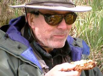 fischen. Zunächst steht wieder eine Stärkung nach dem anstrengenden Vormittag an. Olli und Tommy hatten es am nötigsten, denn ihren Vormittag verbrachten Sie in einer Kneipe unmittelbar an der Etsch. Sie knüpften schnell und unbürokratisch Verbindung mit den freundlichen Südtirolern, welche sie fast abgefüllt hätten. Die Etsch ist heute sauber und klar, aber sehr starker Wind von den Bergen macht ein geruhsames Fischen fast unmöglich. Das ist auch eines der widrigen Umstände welche hier an der Etsch öfter anzutreffen sind. Rechts: Ulli mit Kotelett. Guten Hunger ! |
