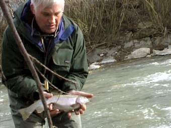 Thomas Zuelke (rechts) ist der Bruder von Olli, ein ruhiger, gemütlicher, die Natur genießender Fliegenfischer–Anfänger. Beide wollen bei mir am Ende des Jahres einen Kurs belegen. Sie haben sich über das Internet bei mir gemeldet und sind auch gleich mit nach Tirol gefahren. Im Jahr 2004 wollen wir zusammen nach Alaska fliegen. Was sie hier in Südtirol mit der Fliegenrute gezeigt haben, ist ein sehr guter Grundstock. |