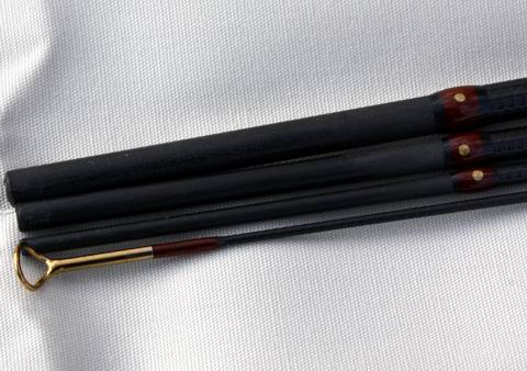 Die vor uns liegende, sehr leichte und zierliche Superfine Touch gefällt auf Anhieb. Farblich ist auch diese Rute absolut stimmig, der schwarze Blank harmoniert gut mit der goldenen Hardware, den dunkelroten, transparenten Bindungen und dem schönen Rollenhalter nebst edler Holzeinlage. An der Ausstattung und der Verarbeitung der ganzen Rute gibt es nichts zu bemängeln. Der Blank ist gerade und fehlerfrei, sowie sauber lackiert. Alle Ringe sitzen gerade in der Flucht, die Ring- und Zierbindungen wurden sauber lackiert und gründlich versiegelt. Der hochqualitative Korkgriff besteht aus 6mm-Korkscheiben und weist keine nennenswerten Löcher und Kittstellen auf. Der Griff liegt mit seiner schlanken Form sehr gut in der Hand, er ist zwar kurz, für diese feine Rute jedoch ausreichend lang und auch vom Durchmesser her gut dimensioniert. Die Zeigefinger- bzw. offene Daumen- Zeigenfingerhaltung wird durch die sanft nach oben verjüngte Griffabstufung unterstützt. |