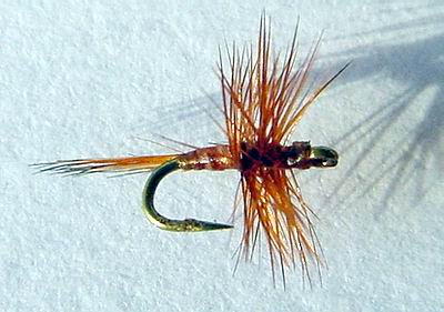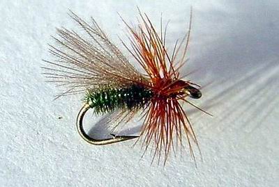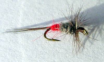 Hexe: Hakengrösse: 10 – 16 (normaler Trockenfliegenhaken) Garnfarbe: schwarz Beschwerung: keine Körper: Pfauengras Schwanz: etwas rotes Garn oder Antron (auch orange möglich, dann heisst sie Orange Tag) Rippung: keine Hechel: Grizzly Grey (Hexe) oder Schwarz (Red Tag) Flügel: keine Variante: mit etwas weissem Antron oder Wolle als Sichthilfe auf dem Rücken. |