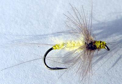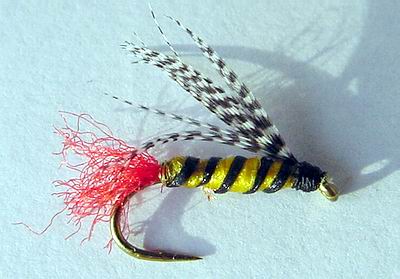 Die Bindeweise weicht von der von Friedemann Franz ab, soweit ich das weiß, gibt es auch Varianten auf Raffia Basis. Haken: TMC 3765, Gr. 12 (Original 11), Schwänzchen rotes Antron, Körper gelbes Floss, dick angewunden, mehrfach lackiert, Ribbung schwarzes Garn, Schwinge Entenrupf. Die Nymphe sinkt auch ohne Blei nicht schlecht. Ein Unterkörper daraus ist sicher immer eine Option." *** Von Marco Reisen alias KyllFischer kommen die beiden nächsten Muster: |