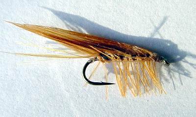 | Hechel abbinden und Kopfknoten setzen. Mit zwei Fingern die oberen Anteile der Hechel zusammenfassen und nach hinten streifen, aber nicht loslassen. Nun die Fibern ordentlich mit Lack tränken und sie durch die Finger durchziehen, damit auch dort Lack ankommt. Langsam nimmt der gewünschte Körper seine Form an. Nicht mit Lack sparen und über die klebrigen Finger ärgern. Aufpassen, daß man das Angel Hair nicht in den Körper mit einbaut. Zum Schluß die unteren Fibern der Hechel kürzen und fertig. Die Fliege hab ich noch nicht ausprobiert, und ich bin mal gespannt wie haltbar sie ist." |