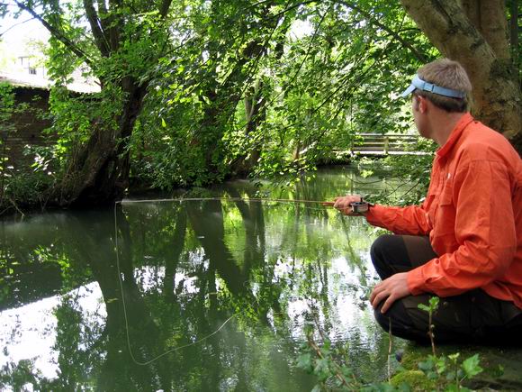 sich einige Meter stromab des vermuteten Fisches im Uferbereich. Dann lässt