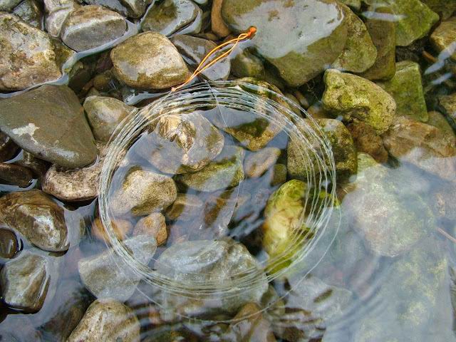 | Mit Hilfe dieser im Vergleich zu einer normalen Fliegenschnur sehr leichten Leine kann man seine Fliege butterweich und schnell ohne jegliche störende Beeinflussung der Wasseroberfläche, welche die Fische alarmiert, präsentieren und auch wieder abheben. Nichts spritzt, platscht oder stört in sonstiger Weise. Die von mir verwendeten Leinen wiegen im trockenen Zustand alle deutlich unter einem Gramm. Die gesamte Schnur ist meist länger als die Rute, was zu einer Besonderheit bei Drill und Landung eins Fisches führt, auf die ich aber später noch näher eingehe. | ![]() |