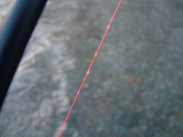Die Leinen sind meist rutenlang. In bestimmten Situationen kommen aber auch längere Leinen zum Einsatz. Die Befestigung der Schnur an der Rutenspitze erfolgt mit einem Buchtknoten an dem Geflechtschlauch, der an den Ruten fest angebracht ist. |