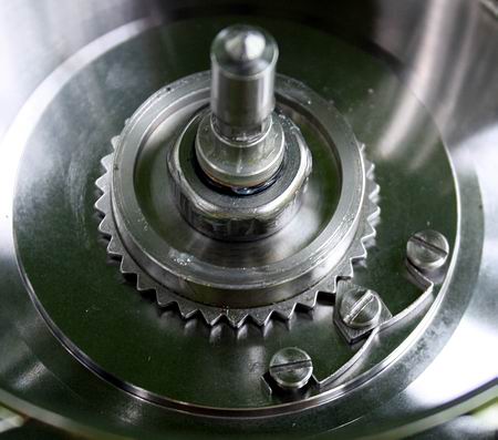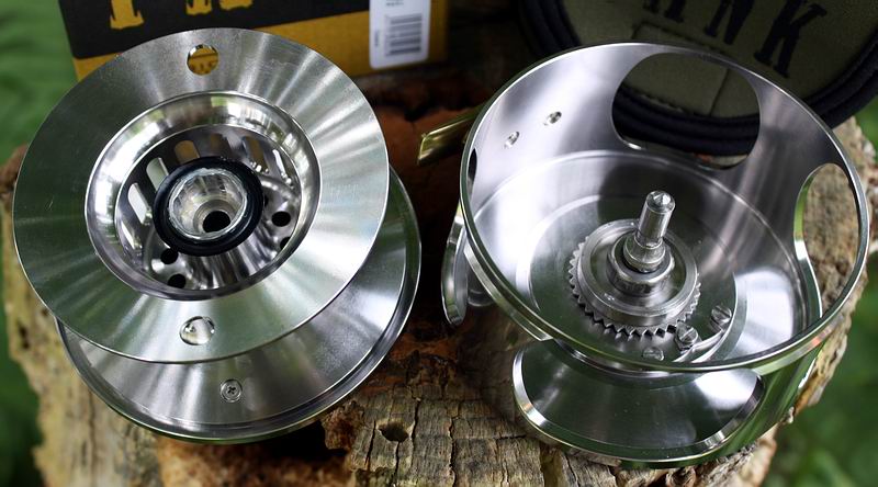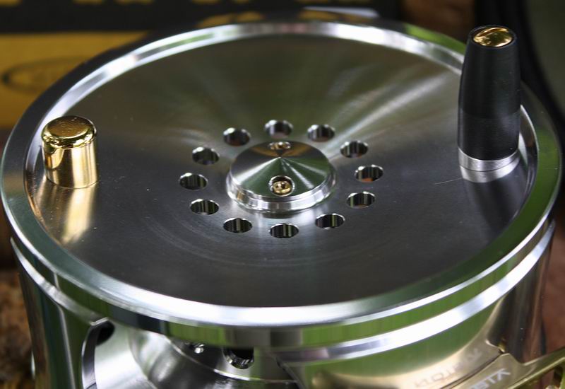 | Die mehrfach gelagerte Spule läuft sauber, rund und auch bei hohen Abzugsdrehzahlen (fast) 100% schlagfrei. Jegliches Spulen-Spiel, Kippeln etc. ist nicht vorhanden, alle Ecken und Kanten von Rolle und Spule wurden gut abgerundet. Im Gehäuse der TANK wurden ein kräftiges Scheibenbremssystem und ein Klicker untergebracht. Mit Hilfe des gut bedienbaren Bremseinstellrades aus Aluminium (Durchmesser 29 mm) auf der Gehäuserückseite lässt sich die kräftige Bremse in zweieinhalb Umdrehungen fein von "frei" bis "kräftig" regulieren. Beim Bremskraft verstärken wird das Einstellrad ca. 0,5 mm im Gehäuse versenkt. Unser Bremsen- Testwert (maximales Abzugsgewicht in Kilogramm bei vollständig geschlossener Bremse und bei gefüllter Spule) ergibt einen Wert von um zwei Kilogramm. Damit ist die Bremse als "mittelkräftig" zu bezeichnen und bietet einen für diese Rollenart- und Schnurklasse, bzw. die Zweihandfischerei auf Lachs & Co. in der Praxis wohl immer ausreichenden Wert. Ein ruckfreies Anlaufen der Spule ist bei jeder Bremseinstellung gewährleistet. Ein ganz leichter Einhol-Grundwiderstand verhindert wirkungsvoll ein unerwünschtes "Nachlaufen" der Spule beim Werfen. | ![]() |