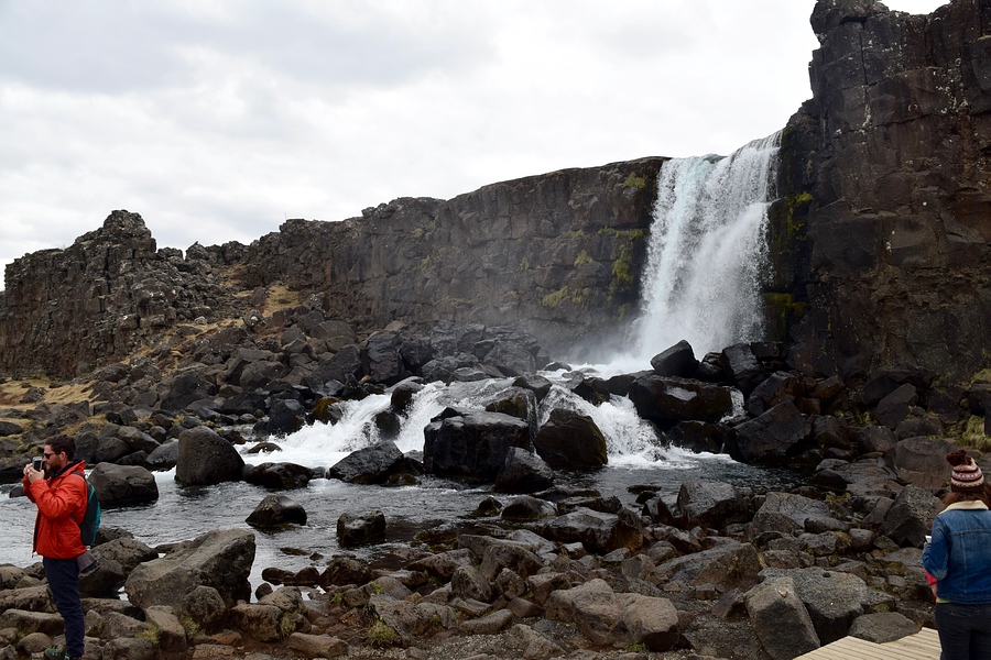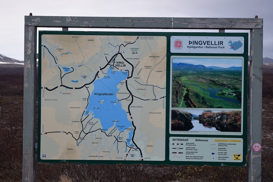 | In Thingvellir im gleichnamigen Nationalpark wurde bereits um 930 durch zugewanderte norwegische Nordmänner einmal jährlich während zwei Wochen im Juni die traditionelle Versammlung Althing abgehalten, die sowohl gesetzgeberische als auch gerichtliche Funktion hatte. Es handelte sich um eines der ältesten Parlamente der Welt, und die Orte gehören heute zum UNESCO-Weltkulturerbe. An dieser Stelle und im weiteren Umfeld wird auch das Auseinanderdriften der amerikanischen und eurasischen tektonischen Platten durch imposante Felsspalten und Risse sichtbar, die auch unter Wasser im See weiterführen. Die tektonischen Verschiebungen lösen immer wieder kleinere Erdbeben aus. In den letzten 10.000 Jahren ist das Land beiderseits der Schlucht um über 60 Meter auseinandergedriftet und der Talboden hat sich um ca. 40 Meter gesenkt. |