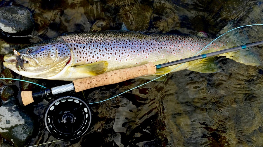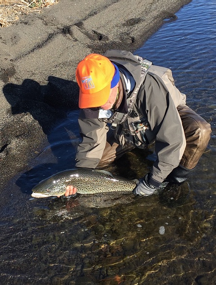 | Am Nachmittag lief dann nix bei mir, aber bei Ankunft am Beat 1 fand ich einen sichtlich befreiten Miguelito vor. Eine tolle Forelle hatte sich seinen Marabou-Black-Ghost-Streamer sofort nach Eintauchen geschnappt, die er behutsam aber kontrolliert drillen und landen konnte. Die hatte er sich echt verdient, die Bilder sprechen natürlich Bände! | ![]() |