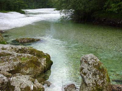 Weiter ins Bluntautal folgt eine Rieselstrecke in der vor allem kleine Äschen und Bachforellen zu finden sind. Vor der schmalen Betonbrücke beim Gasthof Göllhof, in dem nebenbei sehr gut zu essen ist, befindet sich die vorletzte Parkmöglichkeit im Bluntautal. Hier ist auch ein sehr guter Ausgangspunkt für Wanderungen und weitere Erkundungen an der Ache. Flussaufwärts schlängelt sich der Bach durch ein ca. 1,5 km langes, breites Tal mit ausgedehnten, teilweise 40m breiten Schotterbänken. Eine Freude für den ungeübten Werfer. Hier kann man auch ungehemmt zum Rückwurf ansetzen ohne in Gefahr zu kommen dass die Fliege im Geäst endet. In diesem Tal bekommt man stattliche Äschen, Regenbogenforellen, Bachforellen und auch Saiblinge deutlich über 40cm zu Gesicht. Dank Jogging und Radwege ist dieser Teil der Strecke sehr gut zugänglich. |