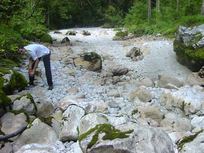 Wer nicht den gleichen Fehler macht wie ich, und im August, im heißesten Sommer seit Menschengedenken bucht, bekommt es auch nicht mit hunderten johlenden Badegästen, die sich in den Pools der unteren Streckenabschnitten suhlen zu tun. Auch ca. zweihunderthundert Meter des Wildbachabschnittes waren völlig trocken. Hier fließt das Wasser unterirdisch weiter und tritt dann wieder im Flussbett zu Tage. Wer also solche kleinen Fehler umgeht, und bis Juni und ab September bucht, bekommt an der Torrener Ache mit Sicherheit unvergessliches Fliegenfischen vom Feinsten. |