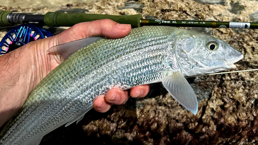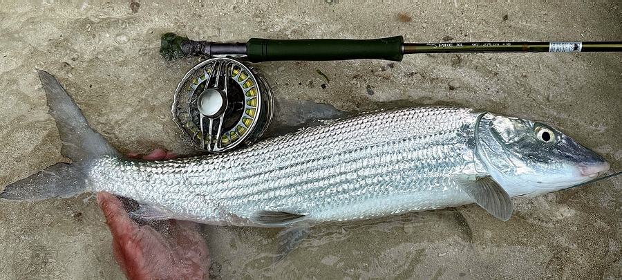 | Nach dem ärgerlichen Bruch meiner Lieblings-SAGE durch einen Hai nahm ich die Pike XL dann verstärkt auch zum Bonefish Angeln mit. Hier wurde mit großen beschwerten Fliegen und starken Vorfächern auf große bis sehr große Bones gefischt. Gerade das Fischen mit diesem Setup und beschwerten Fliegen klappte mit der Pike XL #10 viel besser als mit den vorher verwendeten #8er Ruten. Prompt fing ich mit dieser Kombi u.a. auch meinen größten Bone dieser Reise (76cm). |