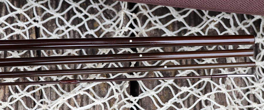 Teilung und Maße: Testmodell TRAUN RIVER TROUT - 8'6" #4: Vierteilige Fliegenrute, Länge 8'6" (zusammengesteckt und nachgemessen 258 cm), vier gleichlange* Teile a. 69 cm (*Handteil 5 mm länger). Das Gewicht der Rute beträgt sehr leichte 67 Gramm. Auf der Rute angegebene Schnurklasse: #4. Blankdurchmesser über dem Griff: 7,5 mm, Blankdurchmesser an der Rutenspitze: 1,53 mm, Länge Rutenrohr: 77 cm, Gewicht Rutenrohr: 560 Gramm. Ausstattung: Glanzlackierter, dunkelbrauner Blank aus Kohlefaser. Die Verbindungen der Einzelteile wurden als exakt passende Überschubverbindungen mit Punktmarkierungen ausgeführt, die oberen Enden der Ruteneinzelteile wurden gegen das Eindringen von Schmutz und Wasser abgedichtet. |
