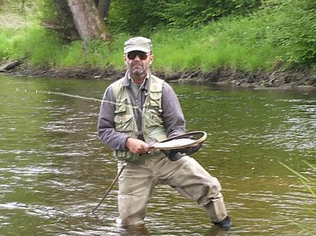 Ich versuchte es mit Nymphen - zwei Regenbogner liessen sich zum Anbiss überreden. Kurz vor 8.00 Uhr, als es langsam wärmer wurde, brach die Freßorgie los. Über dem Wasser kreisten plötzlich zahlreiche kleine Köcherfliegen, die ihre Eier ablegten. Und die Forellen schnappten danach wie wild. Ich band eine 14-er Sedge an die Vorfachspitze, eine 12-er an den Nebenarm und wechselte die Stellung. <= Hans mit seinem Fang |
