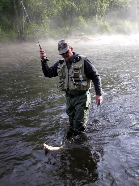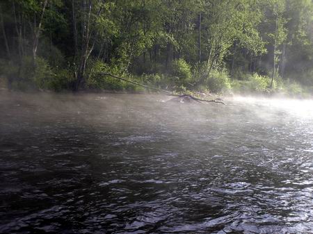 21 Bach- und Regenbogenforellen an einem späten Nachmittag auf Trockenfliege oder abwechslungsweise auf Nymphe, von einem Kursteilnehmer aus der Schweiz gefangen, sprechen dafür, daß beide Reviere mit Verstand bewirtschaftet werden und einen ausgezeichneten Fischbestand aufweisen. An einem Donnerstag, bevor der eigentliche Kurs anfing, wollte ich es mit der Fliegenrute auch selber wissen. Obwohl ich mich nicht gerade zu den Frühaufstehern zähle, war ich schon um 7.00 Uhr am Wasser. Erst hat sich nicht viel getan. Der frühe Nebel bedeckte den Fluß und es war ziemlich kalt. |