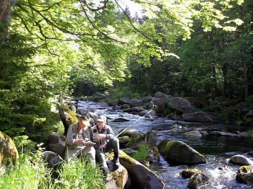 Wir haben während unserer Kurse jedesmal in der gemütlichen Familienpension „Pod Lipou“ in Loucovice gewohnt. Mit deftiger Hausmannskost und dem guten (nicht gefälschten) Budweiser vom Faß, das in der ca. 60 km entfernten Stadt Ceské Budejovice (Böhmisch Budweis) gebraut wird. <= Welche Fliege? Manfred mit Mirek Malek | Unten; Norbert beim CzechNymphing |