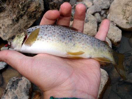 Bachforelle: Kommt in Größen von etwa 10 bis 30 cm vor. Gelegentlich auch bis 40 cm. Letzten Sommer war ich auch an diesem Fluss unterwegs und habe 2 etwa 30 cm lange Bachforellen gefangen mit einer super Kondition.... Regenbogenforellen: Größen etwa auch wie die Bachforellen, aber manche werden auch 50 cm lang, mit einem Gewicht von etwa 1,5 bis 2 Kilo (hat man mir gesagt und ein guter Freund von mir hatte einige dieser Fische schon gesehen, bzw. gehakt, sie aber nicht landen können...). Diese Fische sind aus Zuchtanstalten entkommen und sie nehmen mehr oder weniger alles zu sich, was freßbar ist... |