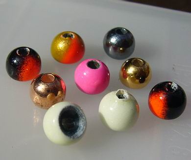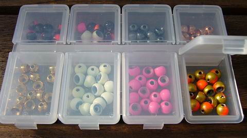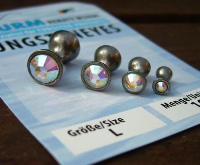 XS / 3 x 5 mm = 0,25 gr. S / 4 x 6,5 mm = 0,65 gr. M / 5 x 8 mm = 1,20 gr. und L / 6 x 10 mm = 2,00 gr. erhältlichen, schweren Streamer-Augen besitzen beidseitig je einen glitzernden, facettenartig geschliffenen, künstlichen Edelsteineisatz - das Geheimnis, warum die meisten Raubfische damit gebundene Streamer zum Fessen gern haben... Preis pro 10 Stück-Box: ab 4,00 Euro. |