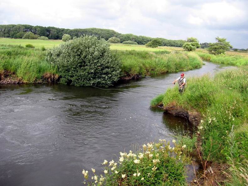 (12/18): Die Storau in Jütland, Dirk wirft die Kante zwischen Strömung und Kehrwasser an.
