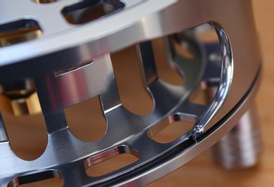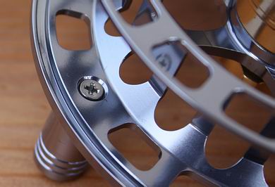 Leichte und schmale Ultra-Großkern-Fliegenrolle in sehr moderner, ansprechender Optik, aus dem vollen 6061-Aluminiumblock gedreht und gefräst. Die Rollenoberfläche ist silberfarben anodisiert, mit goldfarbenen Elementen. Laut Hersteller (von uns nicht geprüft) ist die Rollenserie für den Einsatz im Salzwasser geeignet. Die kugel- und walzengelagerte Spule läuft auf einem mehrteiligen Achsensystem perfekt rund im offenen Rollenrahmen. Die gehäuseseitige Platzausnutzung ist optimal. Die Rollenrückseite ist weitgehend offen bzw. stark durchbrochen, der Spulenkern ist bis auf sechs schmale Stege ebenfalls offen, der Spulenboden wurde zur optimalen Belüftung durchgehend langgelocht, die Spulen-Vorder- und Rückseiten sind mit durchgehenden Lochkränzen versehen. Am Gehäuse befinden sich zwei schmale Stege: hinten ein Steg für den zweifach von Innen angeschraubten Rollenfuß und vorne mittig der Steg für die Schnurführung. Die Gefahr eines ungewollten Durchrutschen von Schnur oder Vorfach zwischen Rollenrahmen und Spule wird durch das tiefe hereingreifen der Stege in die Spulennut und die nur sehr geringen Toleranzen wirkungsvoll vermindert. Auf der Spulenvorderseite befindet sich eine schöne, angenehm große und griffige Kurbel aus Metall in Rollenfarbe, welche butterweich, absolut spielfrei und perfekt läuft. Ihr gegenüber sorgt ein Kontergewicht für einen tadellos ruhigen Spulenlauf. Scharfe Ecken und Kanten sucht man bei der Hardy Ultralite DD vergeblich, ebenso gibt es absolut keinerlei störendes Spiel, kein Kippeln der Spule in ihrer Führung, kein Schlagen und nirgendwo zu große Abstände - das alles spricht für eine äußerst präzise Verarbeitung. Die (Leer-)Rolle ist bis auf einen ganz minimalen Hang zur Kurbelseite gut ausbalanciert. Die Spule lässt sich leicht und einfach wechseln, hierzu wird die Spulenmutter auf der Spulenvorderseite per Hand locker geschraubt, anschließend kann die Spule nach vorne heraus gezogen werden. Die Mutter besitzt eine Führung und kann daher auch im gelockertem Zustand nicht versehentlich verloren werden. |