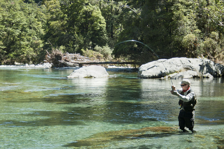 Fliegenfischen in Neuseeland (5/17): Thorben Stegmann drillt einen Fisch im Sabine River, Nelson Lakes, NZ