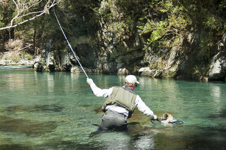 Fliegenfischen in Neuseeland (9/17): Thorben Stegmann keschert einen Fisch im Sabine River, Nelson Lakes, NZ