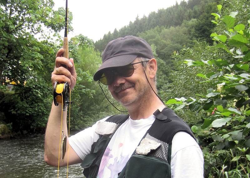 (F-19) | "… anbei mal was Kurioses, mein bisher kleinster an der Fliegenrute gefangener Fisch! Im trüben Hochwasser am 10er Hares-Ear-Jig stromauf an der Strömungskante biss die Elritze tatsächlich wie die Großen: Schnur stand, Anhieb, „Gegenwehr“... Drill ;-) Regulär im Maul gehakt, nicht außen gerissen o. ä. !!" | Foto & Copyright: Stefan Weigelt |