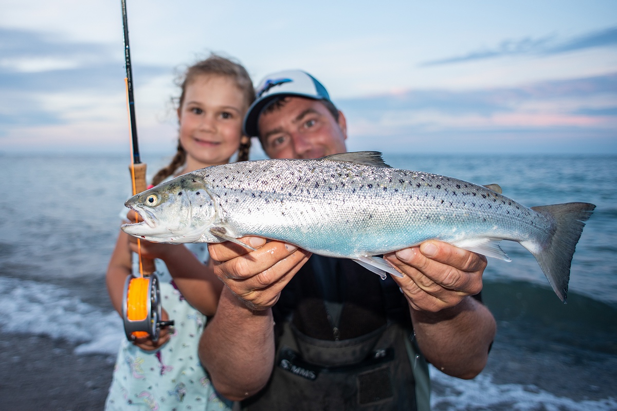 (B-23) | Fliegenfischen auf Meerforelle: Matthias Meyer und seine Tochter mit einer schönen Sommerforelle von der Insel Fehmarn | Foto & Copyright: Andrea Bernhard