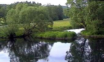 | Durch das nun folgende Wiesengelände windet sich der Weiße Regen in großen, weiten Bögen, an deren Ränder ihn Weiden und Weidengebüsch beschatten. Das Wasser strömt hier tief und ruhig, kein Wunder, dass dort die Heimat der größeren Exemplare zu suchen ist. Kein Wunder, dass ab hier eigentlich immer Fliegenfischer anzutreffen sind. Allerdings zieht sich dieses bessere Stück ca. 4 km bis zur Stadt Kötzting und der dortigen Fischereigrenze hin. |