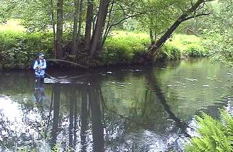 | Auf der anderen Seite fließen hier wieder die Wasser zusammen, die ein Wehr gut 200 m stromauf in einen ehemaligen Mühlenschuss und das Restwasser geteilt hat. Unterhalb des Mühlenwehres ist ein Fischerkollege bereits bemüht, die dort im klaren Wasser ebenfalls gut erkennbaren Forellen und Äschen mittels Nymphe von hinten zu überlisten. |