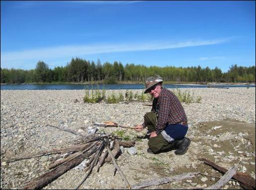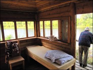 Im Winter hatte es einen Brand gegeben. Drei Holzkabinen sind weg. So sollten 6 Leute in einer großen Holzkabine mit Holzofen, Betten und Elektrizität vom nicht hörbaren Generator untergebracht werden. Die Übrigen bezogen zu je 2 Personen (7) Großwandzelte, die wie das Blockhaus ausgestattet waren. Nach 6 Tagen sollte gewechselt werden, was aber von allen Zeltbewohnern nicht genutzt wurde. Die Anlage enthielt sonst noch ein großes Blockhaus mit Restaurant und Küche, ein großes Blockhaus mit Vorraum, Trockenraum, Sauna und Duschecke, mit 24 Stunden warmem Wasser! Dazu 2 saubere Toiletten, eine Anlage zum Waschen und Zähneputzen, zwei 50 PS Jetboote, sieben 2-Personsschlauchboote und weitere Anlagen, Werkstatt und Gemüsegarten, samt 6 Leute Personal, von denen 2 Guides, inklusive 1 richtiger Fliegenfischer/Fischereiinspektor waren. |